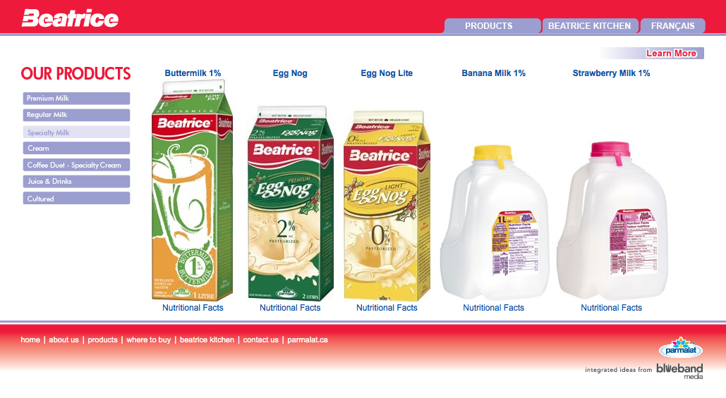 Interestingly, the Beatrice website nolonger lists Chocolate Milk or any of its relations on their product page. Why not? Buttermilk, Egg Nog, Banana Milk and Strawberry Milk are all apparently worthy of mention? Banana and Strawberry milk are not even sold in all provinces, Egg Nog is only available at Christmas time and Buttermilk is for pancakes, not for drinking. Chocolate is available all year round. You wouldn’t be trying to hide your chocolate flavoured dairy concoction, would you?